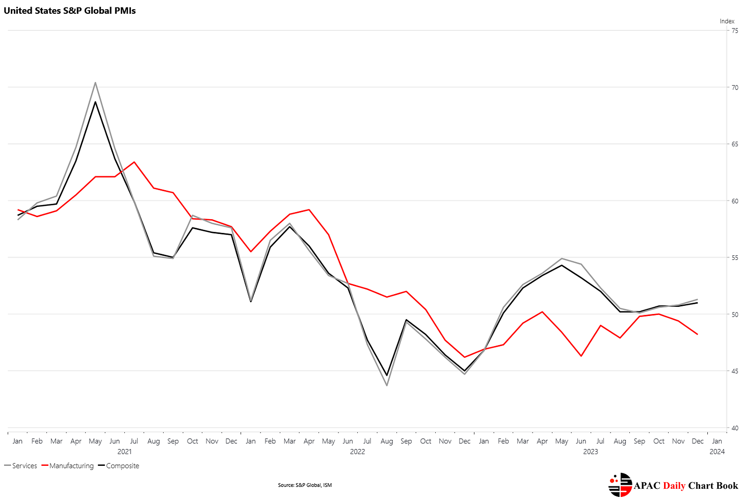 S&P Global flash PMIs showed continued divergence between services and manufacturing. Services and composite measures firmed in December, with the composite measure at 51 compared to 50.7 in November. Manufacturing slipped further into contractionary territory at 48.2 compared to 49.4 in November.