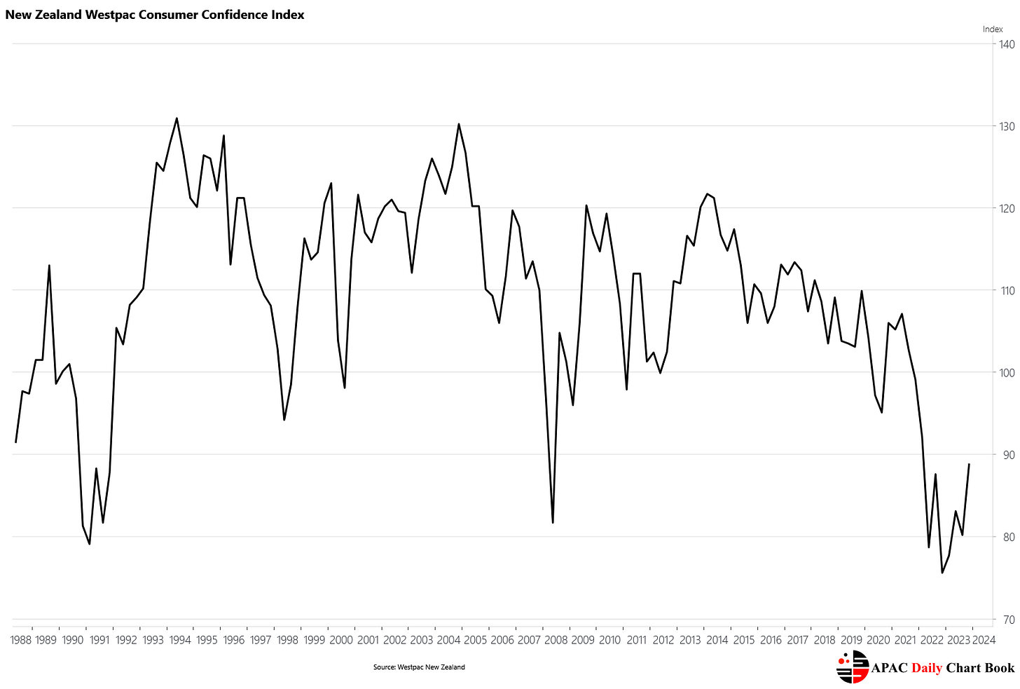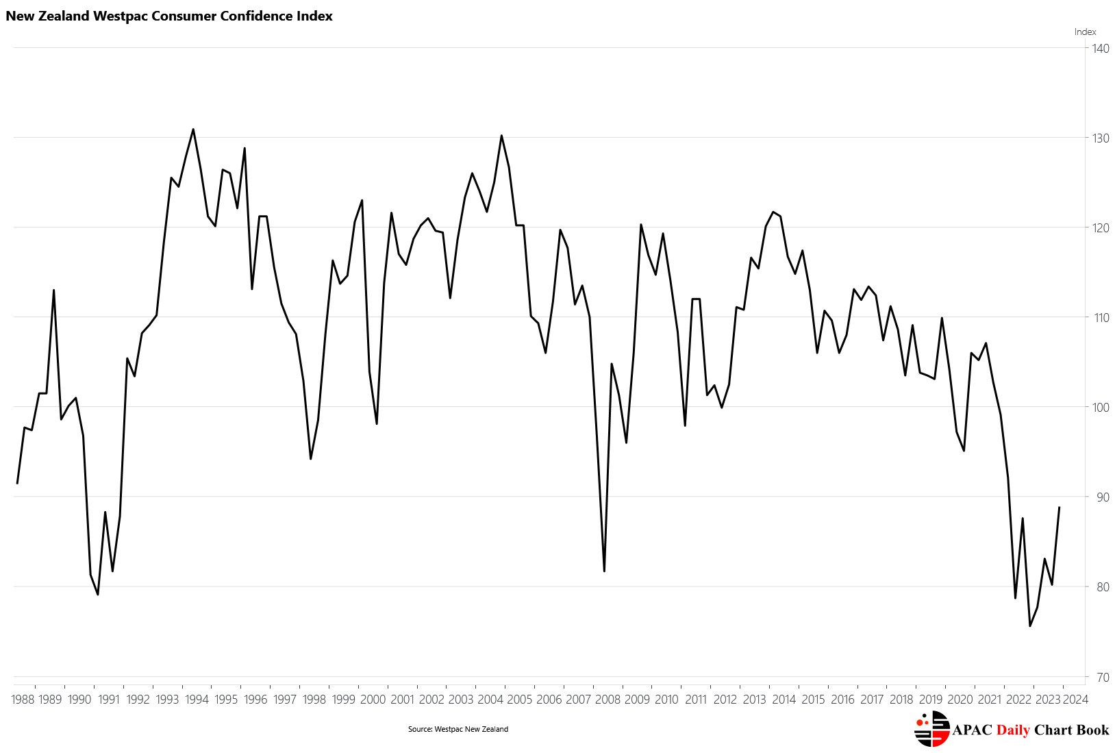 The Westpac-McDermott Miller Consumer Confidence Index rose 8.7 points to 88.9 in December, but remains at depressed levels relative to its historical average, consistent with the contraction in economic activity reported in Q3.